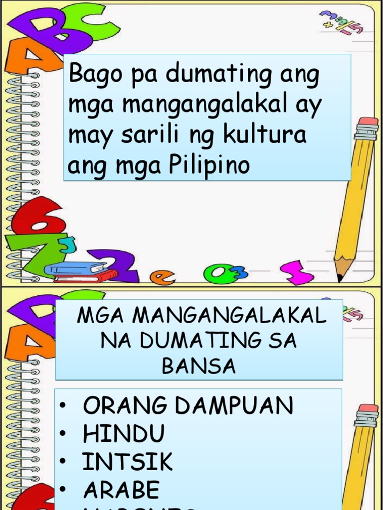 Impluwensya ng mga arabe sa kulturang pilipino. Ang Pilipinas ay tinaguriang mayaman sa ibat ibang larangan sa kultura ngunit nang dumating ang mga Espanyol Amerikano at Hapon sa ating bansa marami ang naging pagbabago sa kulturang Filipino dahil sa impluwensya ng mga nasabing dayuhang bansa. Ang Kristiyanismo ay isa sa pangunahing dahilan ng pananakop ng Espanya. Nabuo rin ang mga natatanging panitikan na may.